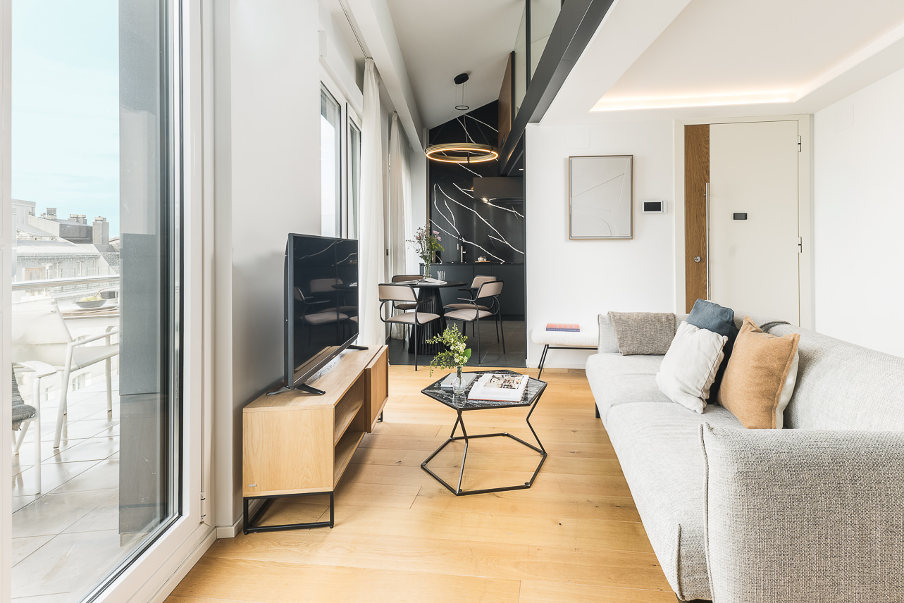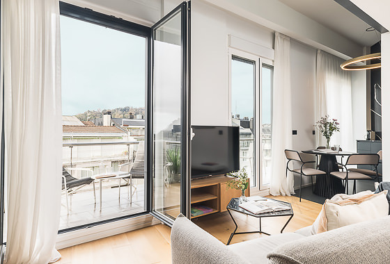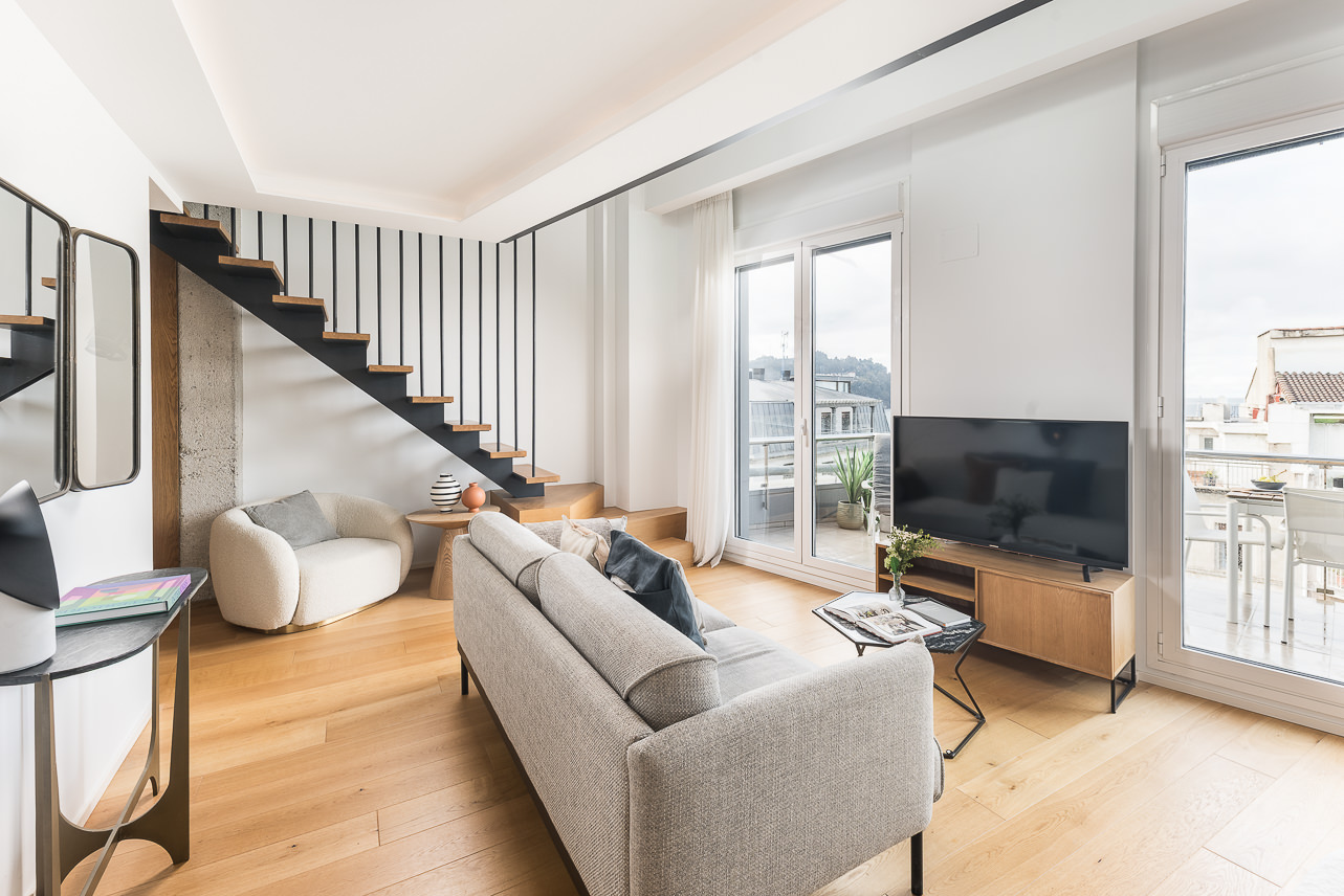 En la última planta de un edificio representativo en el prestigioso barrio de Miraconcha, este ático dúplex de 2 dormitorios ofrece una experiencia residencial singular, marcada por sus vistas abiertas al mar, su cuidada distribución en dos niveles y sus terrazas privadas. La vivienda combina diseño contemporáneo con una excelente entrada de luz natural, gracias a sus ventanales de suelo a techo y sus múltiples salidas al exterior. Su ubicación privilegiada permite disfrutar de una persp… Leer más