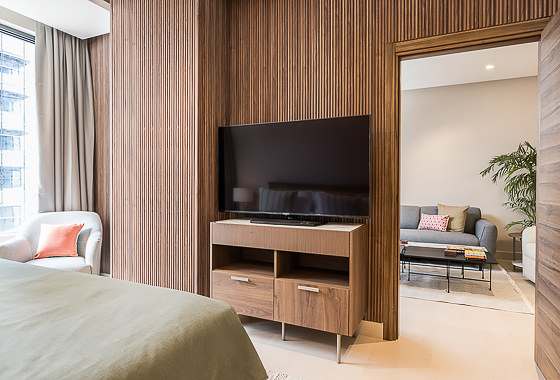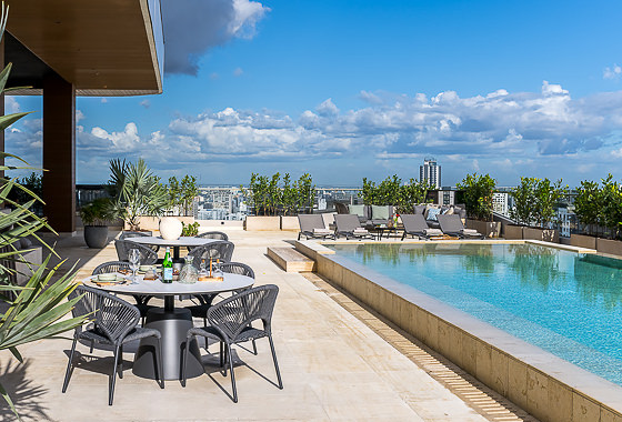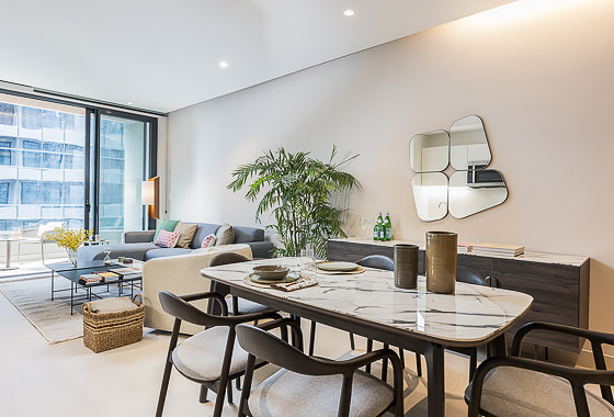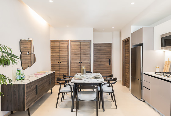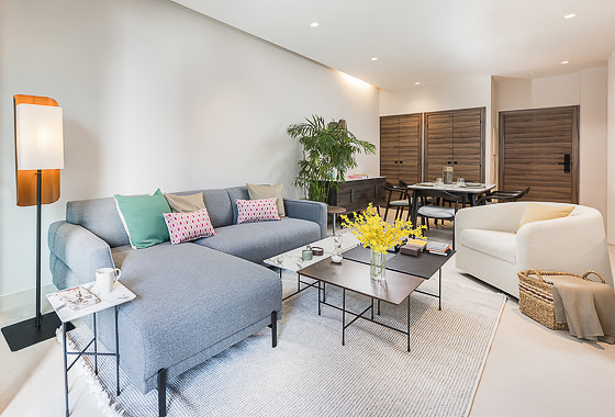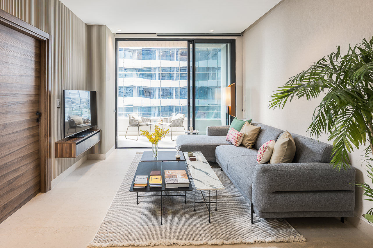 Located in Blue Mall Luxury Suites, this apartment combines contemporary design, spacious interiors, and open city views in the most exclusive and strategic area of Santo Domingo. The one-bedroom apartment typology shown is representative of units located between floors 9 and 15. The residence is organized around a spacious and bright living area, featuring a lounge with direct access to the private terrace that extends the interior space outdoors. Decorated in neutral tones and refined ma… Read more