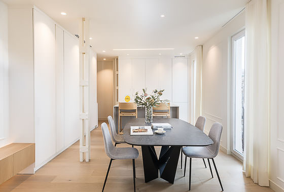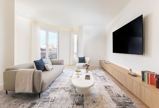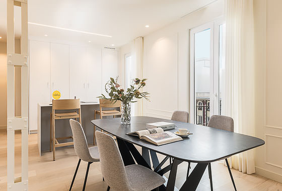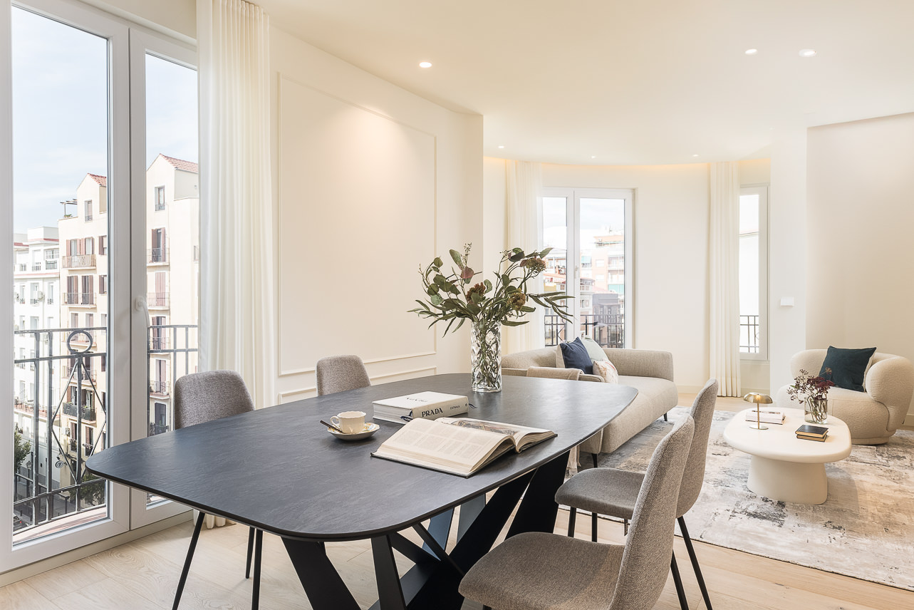 This apartment on upper floor is located in a classic neoclassical building, typical of Madrid, featuring an elegant façade and wrought-iron balconies that add character. The property stands out for its large windows overlooking Calle Narváez, allowing abundant natural light and a strong visual connection with the urban surroundings. The interior features original moldings on ceilings and walls, adding a distinctive touch to the apartment’s contemporary design. The furnishings combine nat… Read more