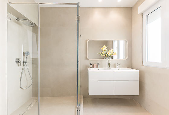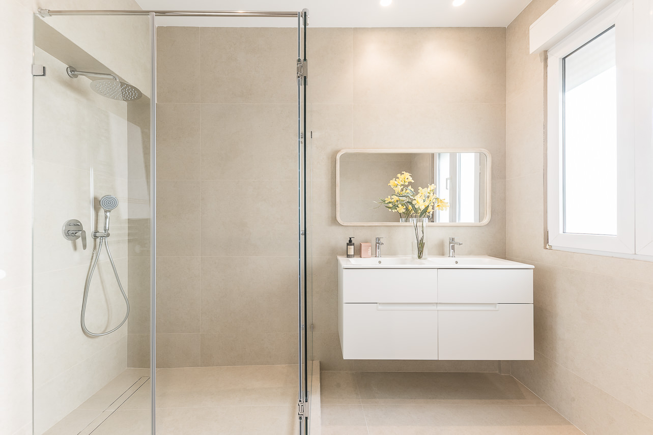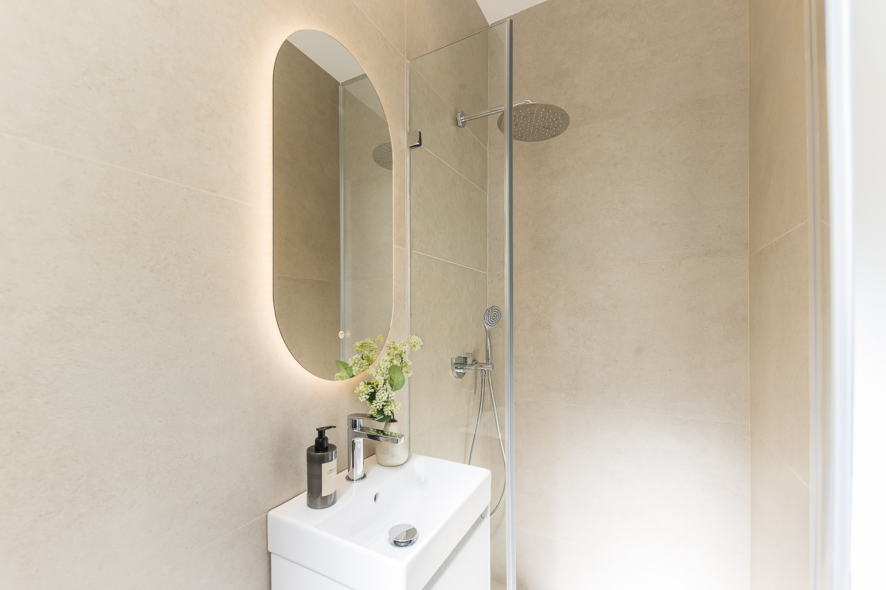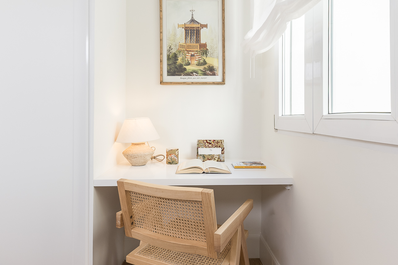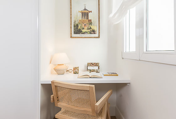 Materials and finishes have been carefully selected to convey a sense of warmth and quality: natural oak herringbone floors, a sleek kitchen with marble-effect porcelain countertops, bathrooms clad in natural stone, and custom-built lacquered wardrobes. The furnishings combine understated design with natural textures—woven fibres, richly grained wood, soft upholstery, and sculptural lighting that adds personality without excess. One of the bedrooms includes a fully equipped study area, perfect for remote workers or digital nomads. Every detail, from geometric nightstands to framed mirrors, contributes to a sophisticated, cohesive, and timeless aesthetic.