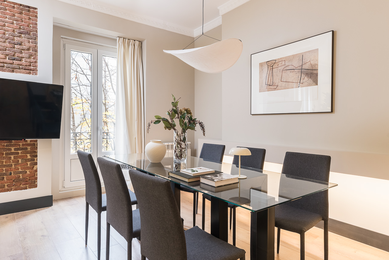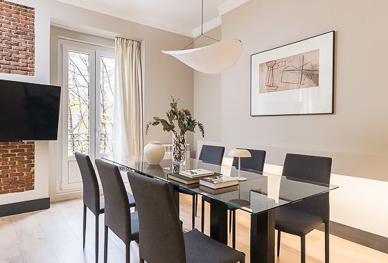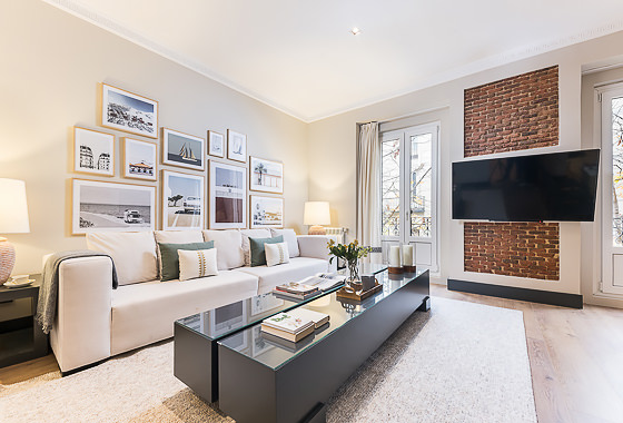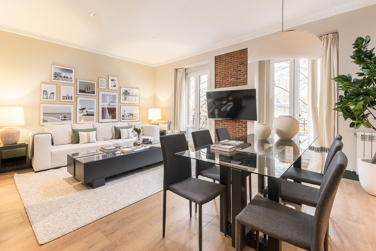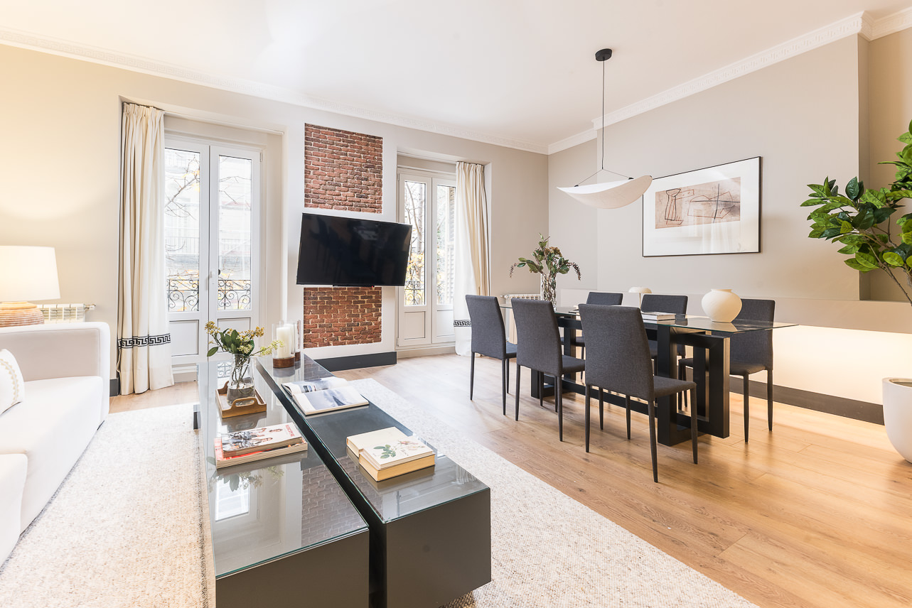 Located on the second floor of a stately building on Calle Padilla, this 120 m² apartment combines modern style and comfort in every detail. Thoughtfully decorated by our Homeclub interior design team, it blends contemporary design with warm, welcoming touches: natural wood floors, an exposed brick wall framing the smart TV for an industrial flair, and modern furniture with light-toned textiles that create a bright and inviting atmosphere. The lighting has been carefully designed to evoke a tru… Read more
