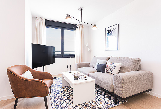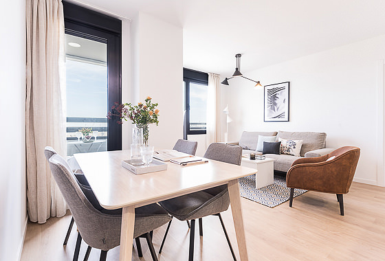 This flat is located in the Living Valdebebas building, a residential development that offers a new way of living: your home, your workspace and your community all in one place, with areas designed for sharing. It features comprehensive communal facilities, including a lobby with relaxation areas, a residents’ gym, a rooftop terrace with a chill-out area, a barbecue area, a swimming pool and gardens. Inside, the flat features an open-plan space combining the living room and kitchen, divided… Read more