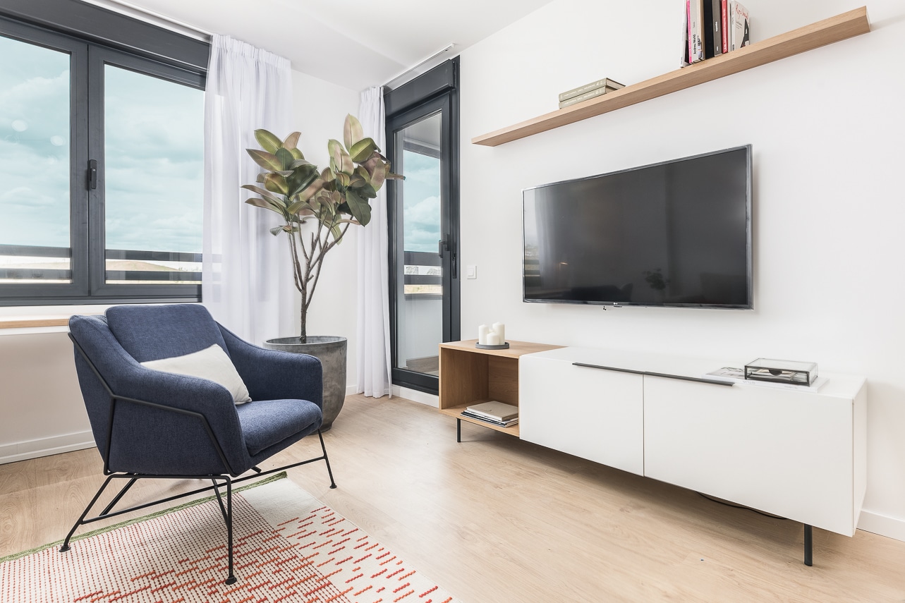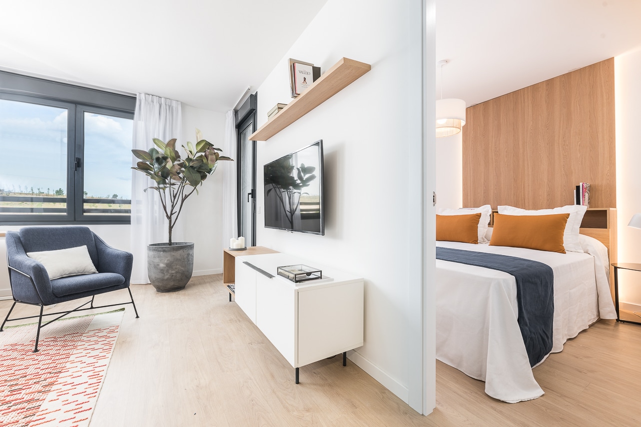 This flat is located in the Living Valdebebas building, a residential development that offers a new way of living: your home, your workspace and your community all in one place, with areas designed for sharing. It features comprehensive communal facilities, including a lobby with relaxation areas, a residents’ gym, a rooftop terrace with a chill-out area, a barbecue area, a swimming pool and gardens.… Read more
